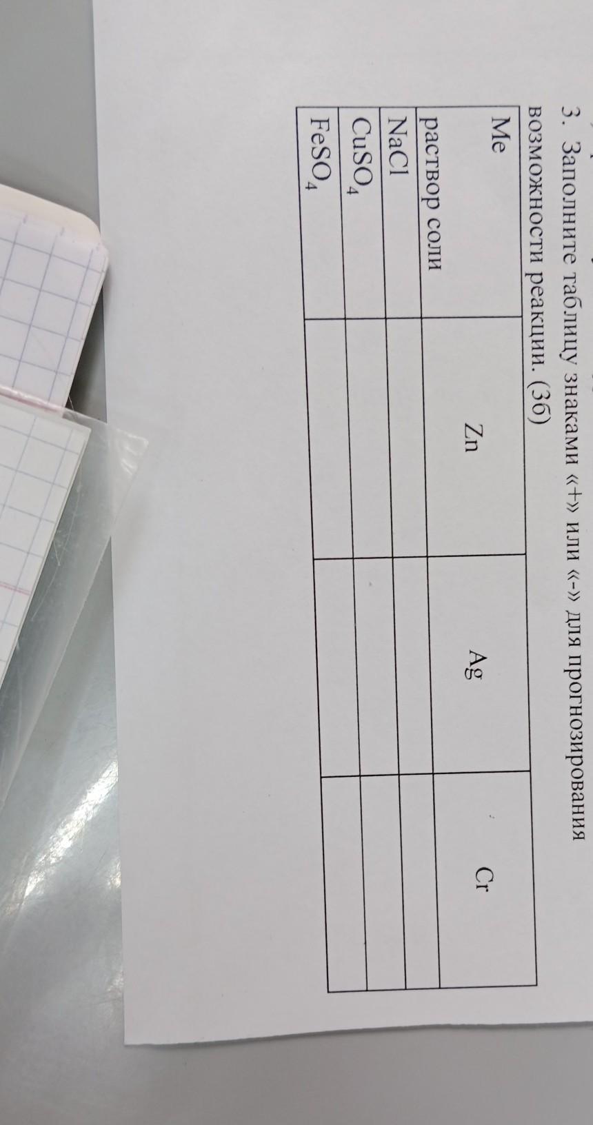 3. Заполните таблицу знаками «+» или «-» для прогнозирования возможности реакции. (3б) Me раствор солИ NaCl CuSO FeSO4 Zn Ag Cr