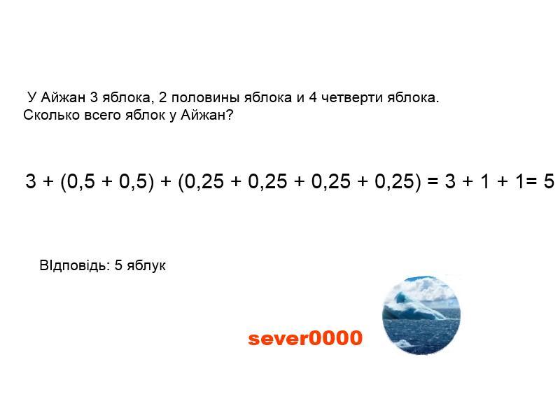 3 + (0,5 + 0,5) + (0,25 + 0,25 + 0,25 + 0,25) = 3 + 1 + 1= 5 (яблок)