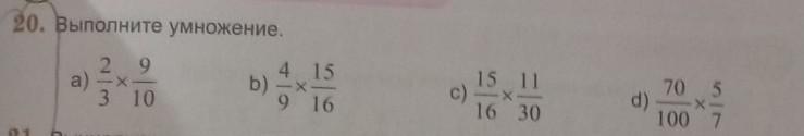 20. Выполните умножение а) 2/3 * 9/10 b) 4/9 * 15/16 c) 15/16 * 11/30 d) 70/100 * 5/7
