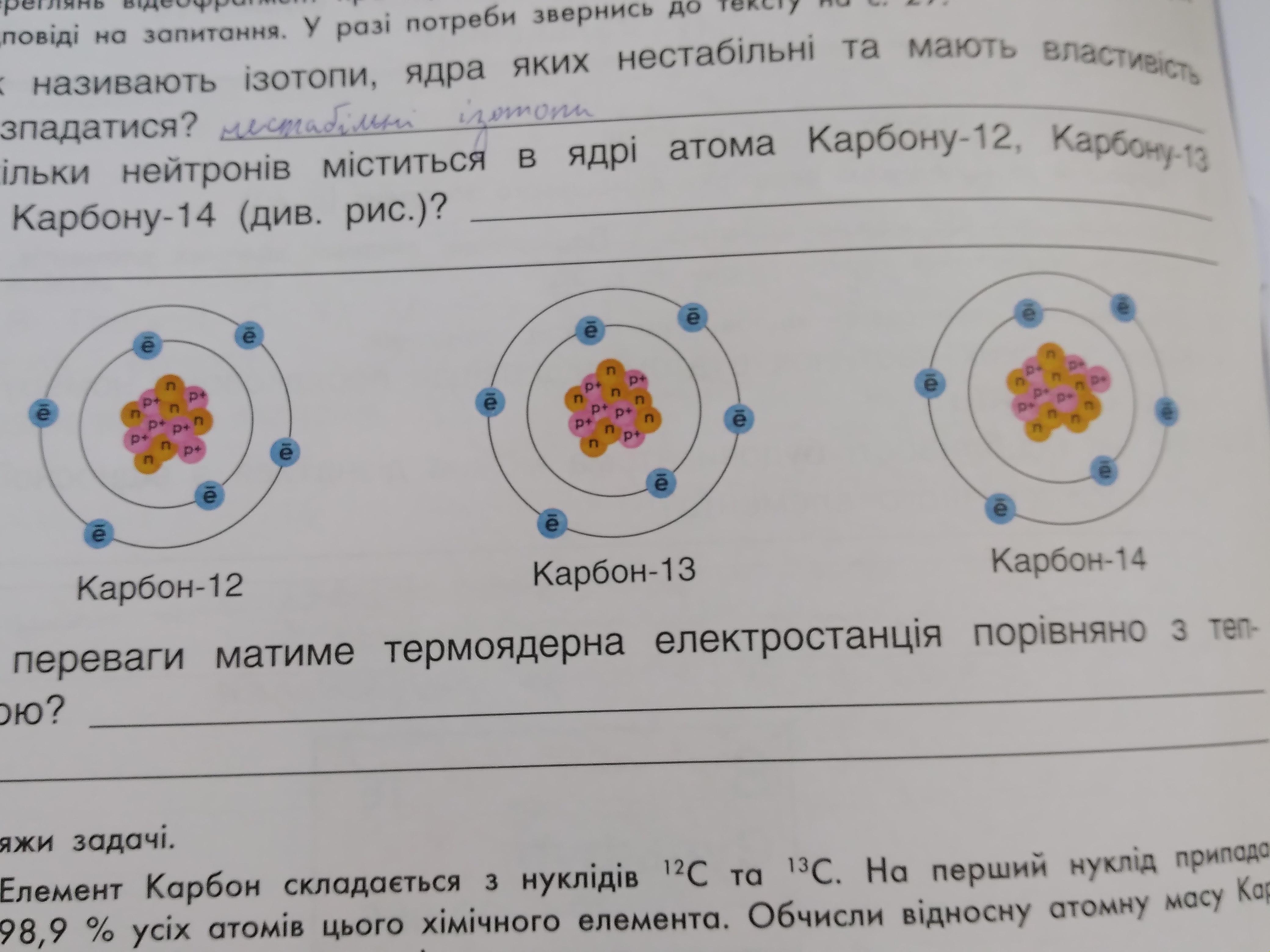 Відповідь: Карбон-12 - 12-6=6, Карбон-13 - 13-6=7 та Карбон-14 - 14-6=8
