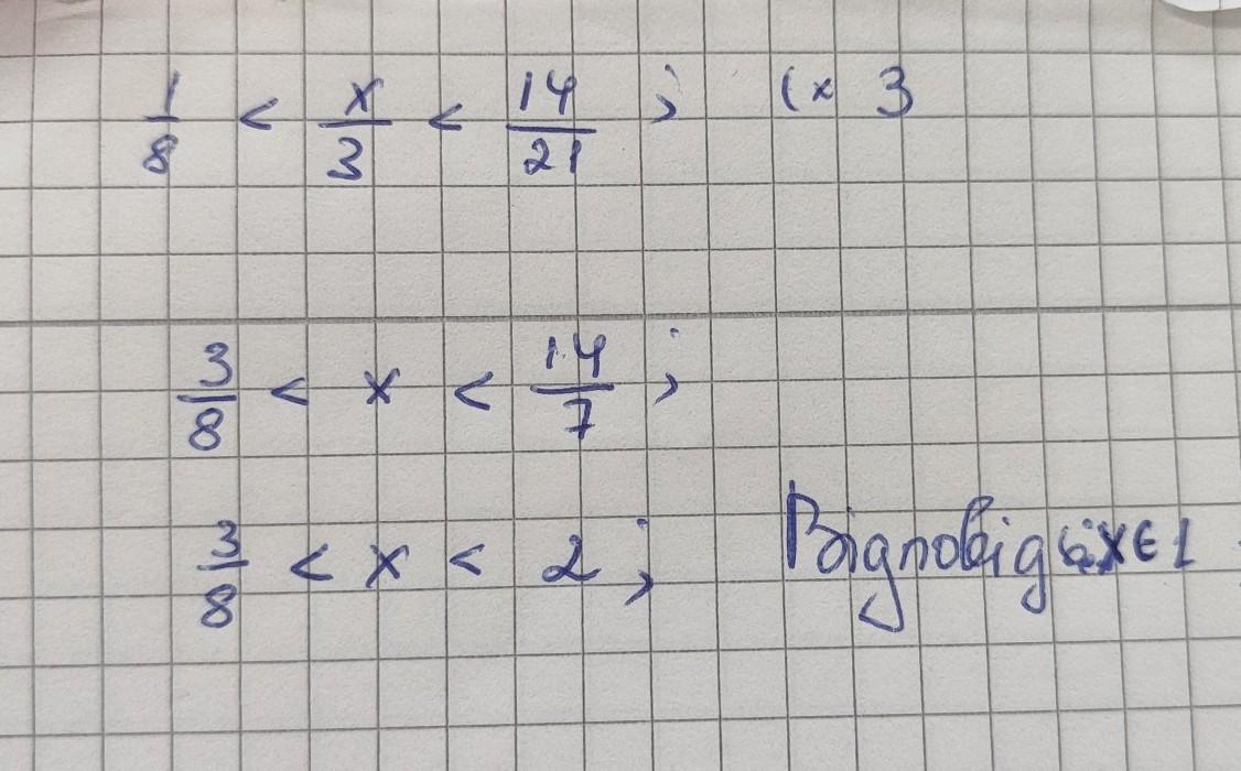 Позбуваємося знаменника у х, для цього домножуємо нерівність на 3, відповідно і ліву і праву її частини. У дробі з права можна виділити цілу частину, отримуємо кінечну нерівність. Натуральні числа, числа якими ми лічимо. Відповідно десяткові дроби натуральними не вважаються. Єдиним натуральним числом в цих межах є 1, адже х за нерівністю має бути менше за 2.