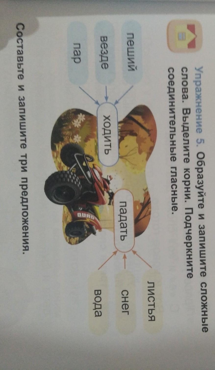 Упражнение 5. Образуйте и запишите сложные слова. Выделите корни. Подчеркните соединительные гласные. Составьте и запишите три предложения.