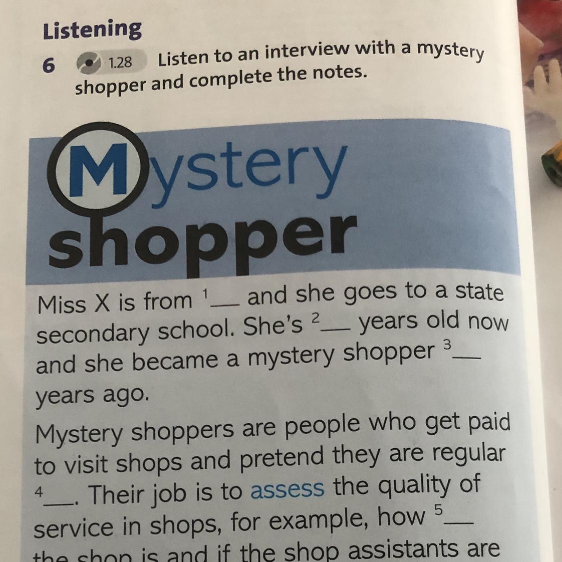 Listening 1.28 Listen to an interview with a mystery shopper and complete the notes. 6 Mystery shopper Miss X is from ¹ and she goes to a state secondary school. She's 2 years old now and she became a mystery shopper 3 years ago. Mystery shoppers are people who get paid to visit shops and pretend they are regular 4. Their job is to assess the quality of service in shops, for example, how 5 the shop is and if the shop assistants are 6. Sometimes they also write 7 of the products they have bought. Mystery shoppers don't usually earn very much, and not all shopping experiences are pleasant. Once Miss X had problems with a product which she bought 8. It's not difficult to become a mystery 9 shopper, but you have to be _____ because some companies are fake and might send you a lot of 10 messages