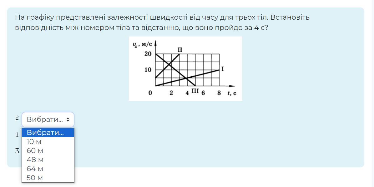 На графіку представлені залежності швидкості від часу для трьох тіл. Встановіть відповідність між номером тіла та відстанню, що воно пройде за 4 с?
