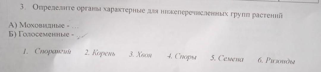 3. Определите органы характерные для нижеперечисленных групп растений -) Моховидные -) Голосеменные - 1. Спорангий 2. Корень 3. Хвоя 4. Споры 5. Семена 6. Ризоиды