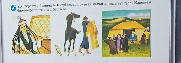 28. Суреттер боюнча 5-6 сүйлөмдөн турган чакан аңгеме түзгүлө. Класстан бири-биринерге окуп бергиле. дам 100 баллов