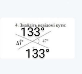 Объяснение:В нас є відомий кут,він має 47°,він вертикальний,вертикальні кути рівні.Сума суміжних кутів 180°.180°-47°=133°,оскільки кут вертикальний,то той кут що залишився дорівнює теж 133°