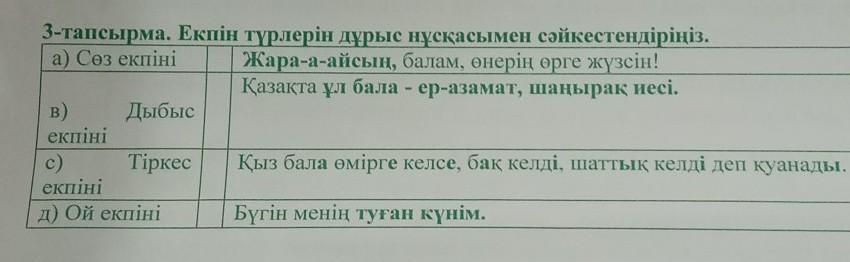 3-тапсырма. Екпін түрлерін дұрыс нұсқасымен сәйкестендіріңіз. а) Сез екпіні Жара-а-айсың, балам, өнерің өрге жүзсін! Қазақта ұл бала - ер-азамат, шанырак иесі. B) екпiнi Дыбыс Тіркес c) екпіні д) Ой екпіні Қыз бала өмірге келсе, бак келді, шаттык келді деп куанады. Бүгін менің туған күнім.