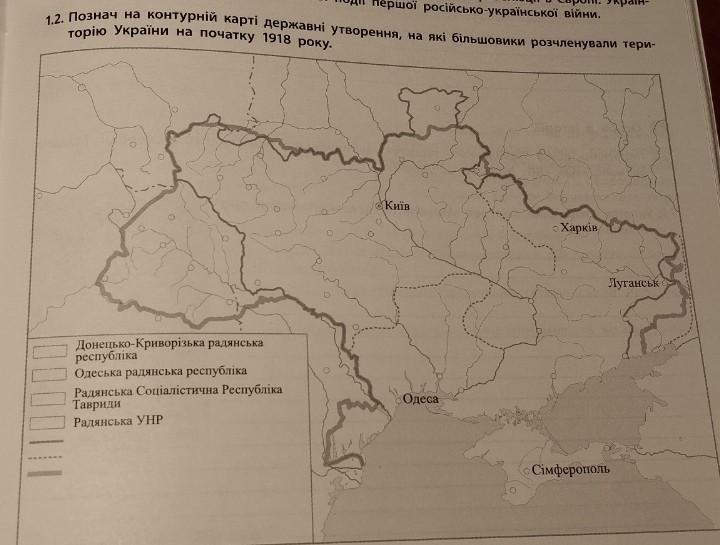 Познач на контурній карті державні утворення на які більшовики розчленували територію України на початку 1918 року