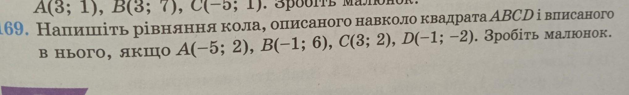 Напишіть рівняння кола, описаного навколо квадрата ABCD і вписаного в нього, якщо А(-5; 2), B(-1; 6), C(3; 2), D(-1; -2). Зробіть малюнок.