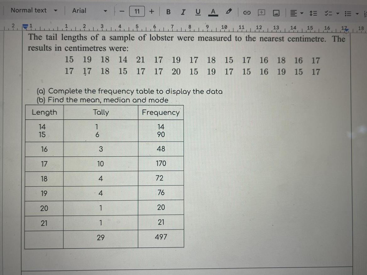 измеряли длину хвоста с точностью до сантиметра и результаты записаны числами в 2 строки. Затем эти числа записали в виде таблицы, где 1 столбик - длинна, 2 - сколько раз такое значение попадалось и 3 - это результат перемножения 1 столбика на 2. только сумма во 2 столбике неверно посчитана: результат 30, а не 29 и сумма по 3 столбику 511 (скорее всего не учли 1 строку в таблице, когда вносили формулу)