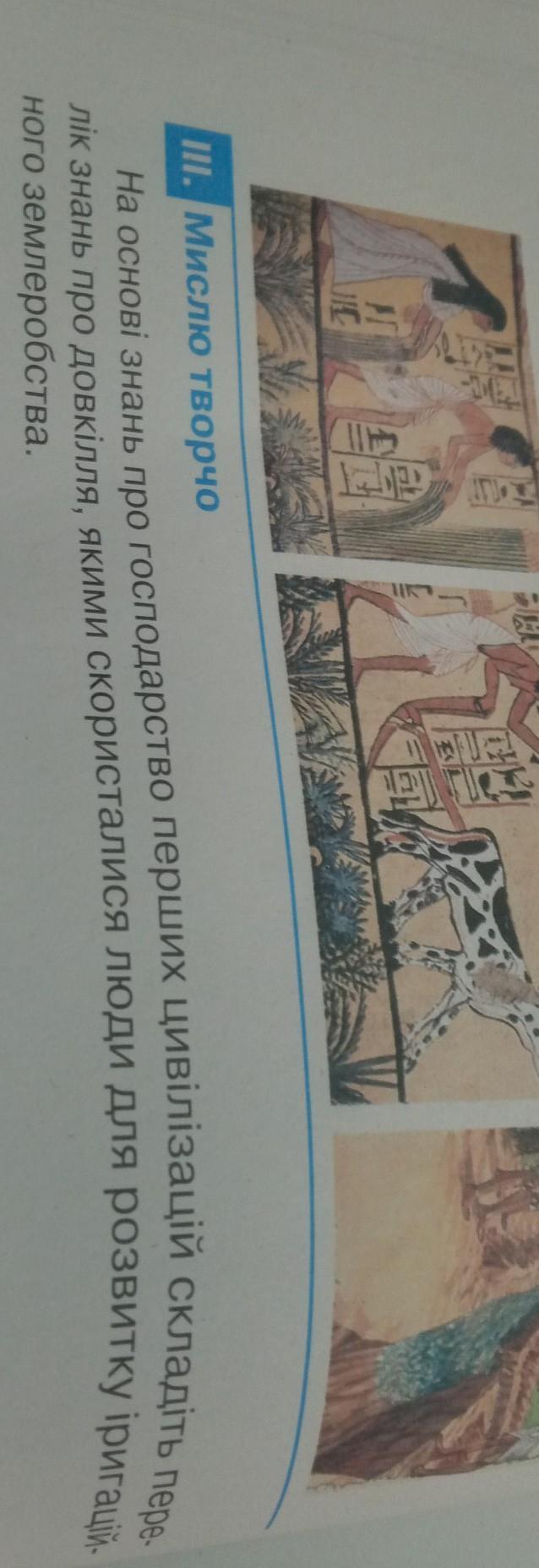 На основі знань про господарство перших цивілізацій складіть пере- лік знань про довкілля, якими скористалися люди для розвитку іригацій- ного землеробства.