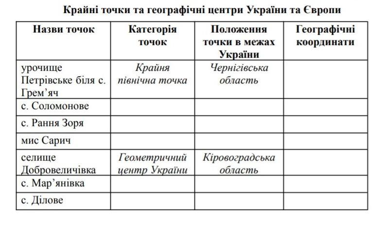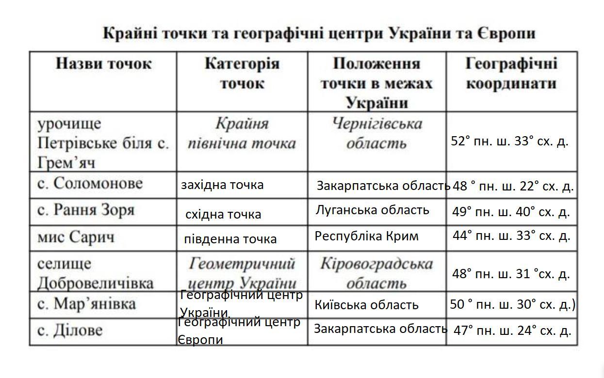 - Крайні точки та географічні центри України та Європи дани у таблиці нижче у додатку.