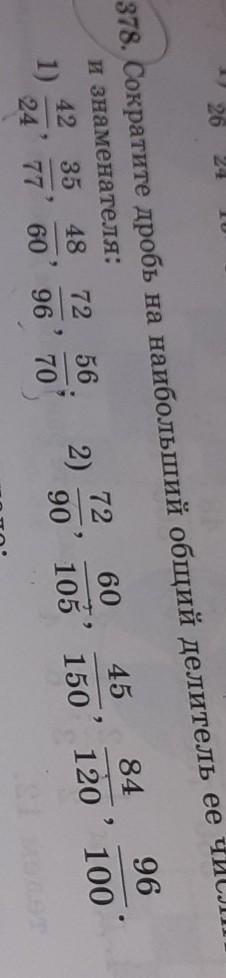15- 35 108 1) 378. Сократите дробь на наибольший общий делитель ее числителя и знаменателя: 42 35 48 72 24 77 56 60 96 70 9 42 39 51 60 100 2) 72 60 90 105 45 84 96 150 120 100 9
