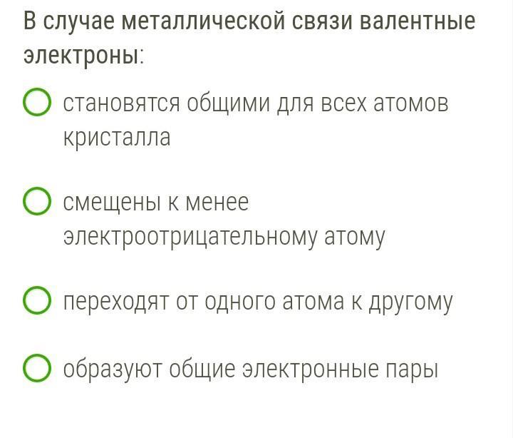 В случае металлической связи валентные электроны: О становятся общими для всех атомов кристалла О смещены к менее электроотрицательному атому О переходят от одного атома к другому образуют общие электронные пары