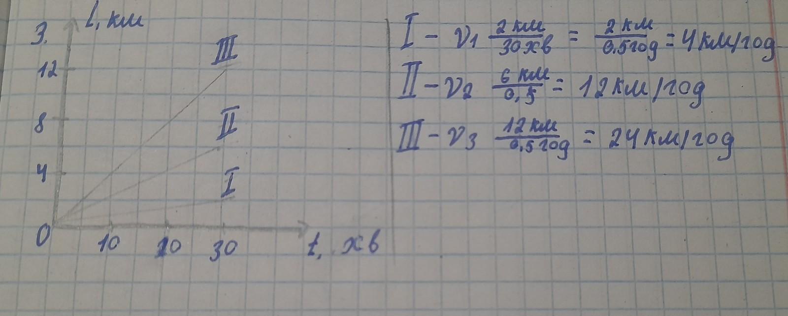 3. На рис. 2 зображені графіки шляхів для пішохода, велосипедиста й трактора, які рухаються зі швидкостями 4, 12 і 24 км/год відповідно. Який iз зображених графіків якому тілу відповідає? Побудуйте графіки швидкості руху зазначених тіл.