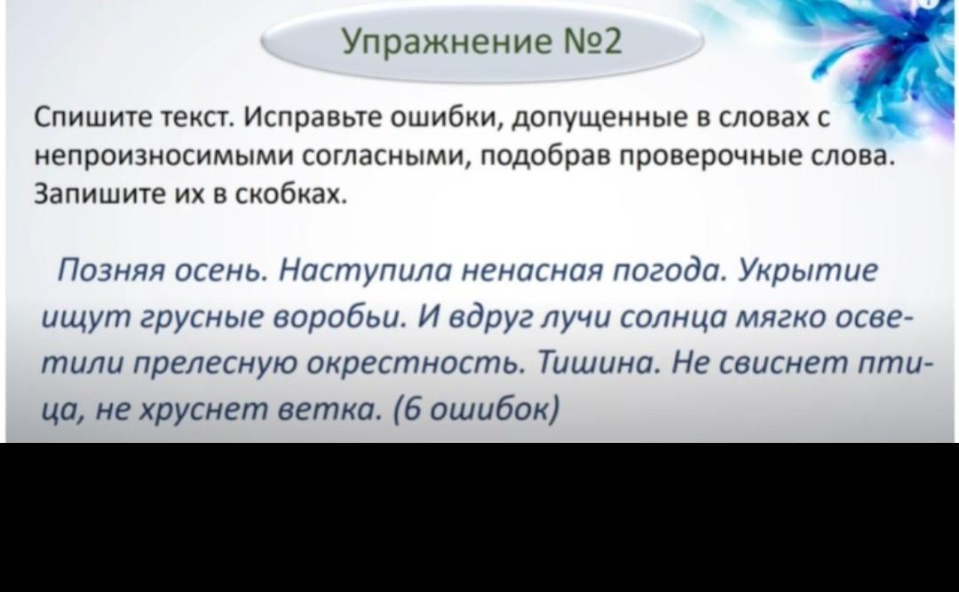 Упражнение №2 Спишите текст. Исправьте ошибки, допущенные в словах с непроизносимыми согласными, подобрав проверочные слова. Запишите их в скобках. Позняя осень. Наступила ненасная погода. Укрытие ищут грусные воробьи. И вдруг лучи солнца мягко осве- тили прелесную окрестность. Тишина. Не свиснет пти- ца, не хруснет ветка. (6 ошибок)