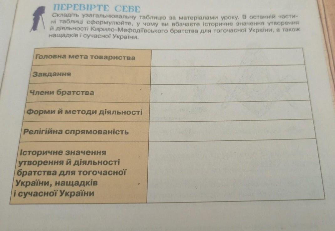 ПЕРЕВІРТЕ СЕБЕ Создать узагальнювальчу таблицо за матеріалами уроку. В останній части- таблиц сформулюйте, у чому ви вбачаете iсторичне значення утворення братства для тогочасної України, а також а діяльності Кирило-Мефодіївського нащадків сучасної України.