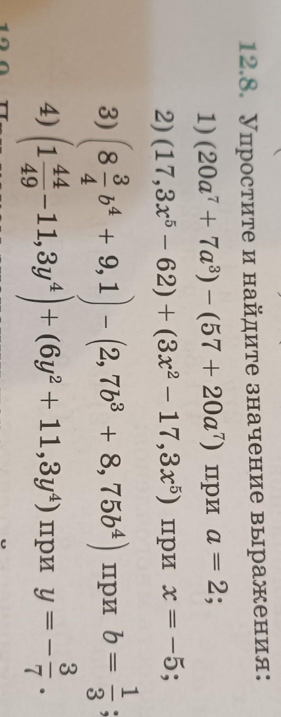 12.8. Упростите и найдите значение выраж 1) (20a7 + 7a³) - (57 +20) при а = 2; (17,3x5-62)+(3x²-17,3x³) при x=-5; 2) 3 3) (8³ 6¹ + 9, 1) – (2, 76³ +8,756¹) пpи b = 3 3 44 4) 1 −11,3y*) + (бу² + 11,3у²) при у 49 7'