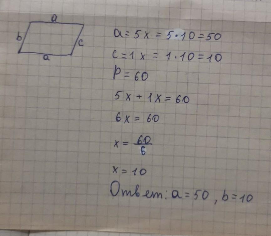 Периметр параллелограмма равен 60 см. Найдите стороны параллелограмма, если стороны относятся как 1:5