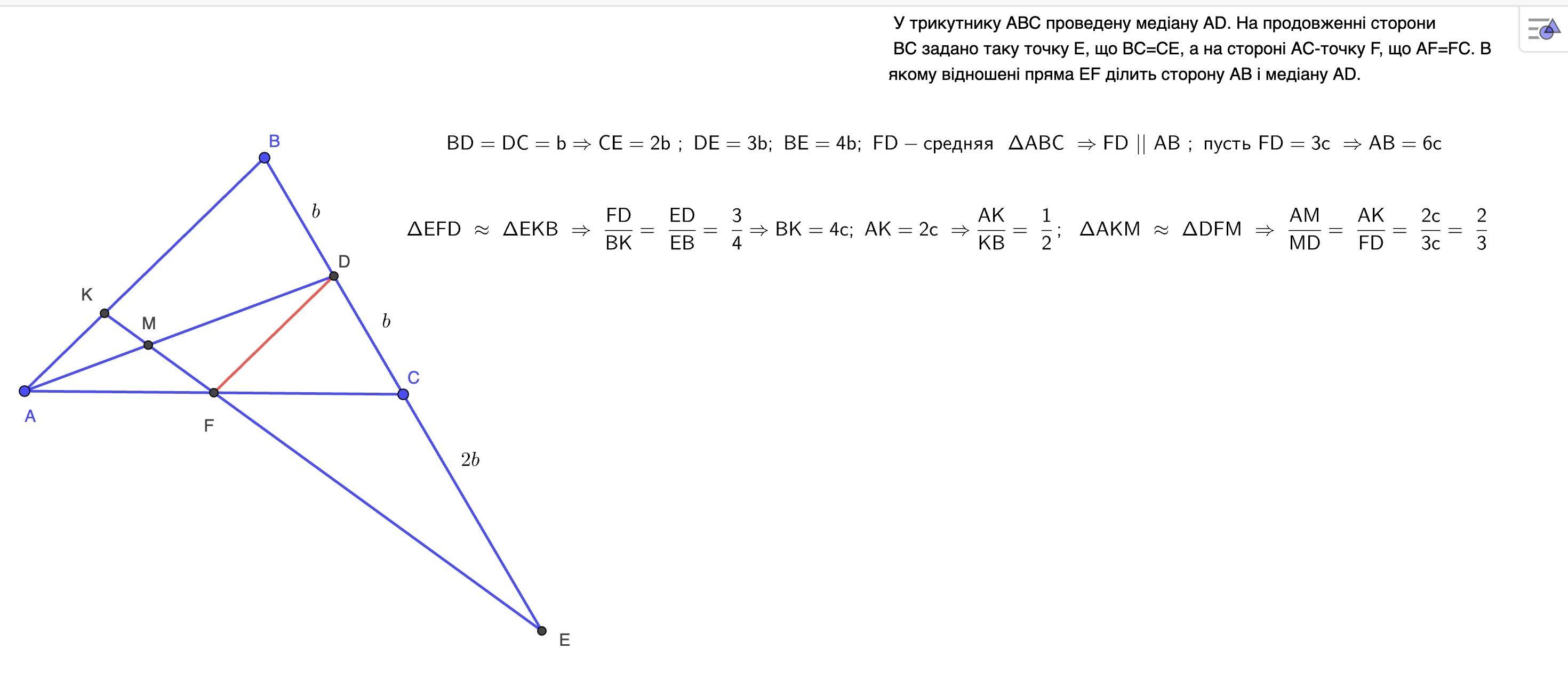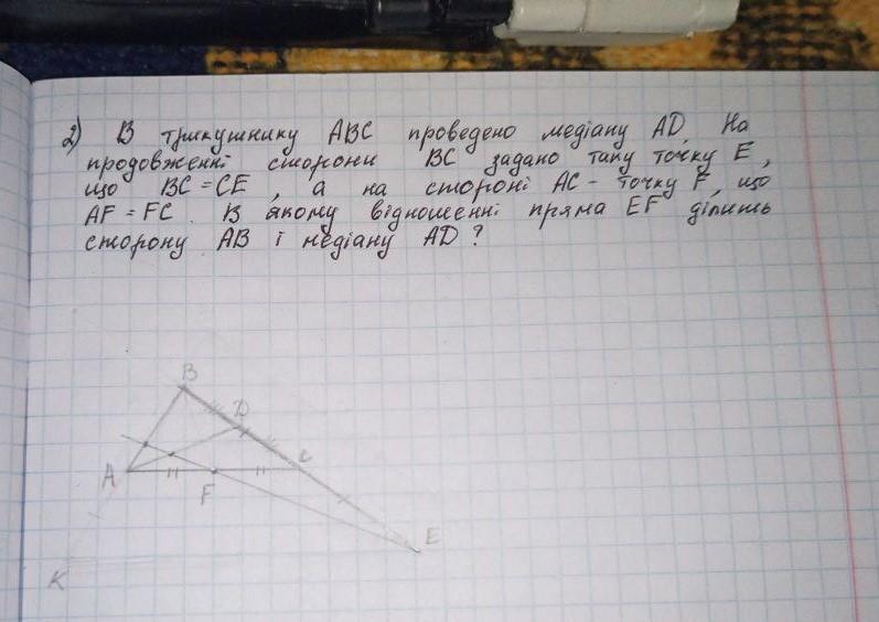 Вирішити задачку . У трикутнику АВС проведену медіану AD. На продовженні сторони BC задано таку точку Е, що ВС=СЕ, а на стороні АС-точку F, що AF=FC. В якому відношені пряма EF ділить сторону AB і медіану AD.