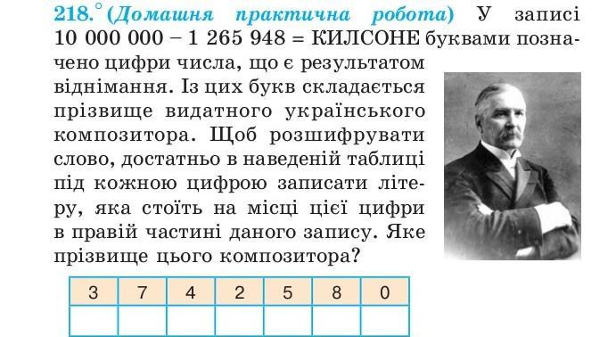 218.0 (Домашня практична робота) у У записі 10 000 000 - 1 265 948 = КИЛСОНЕ буквами позна- чено цифри числа, що є результатом віднімання. Із цих букв складається прізвище видатного українського композитора. Щоб розшифрувати слово, достатньо в наведеній таблиці під кожною цифрою записати літе- ру, яка стоїть на місці цієї цифри в правій частині даного запису. Яке прiзвище цього композитора? 3 7 4 5 2 8 0