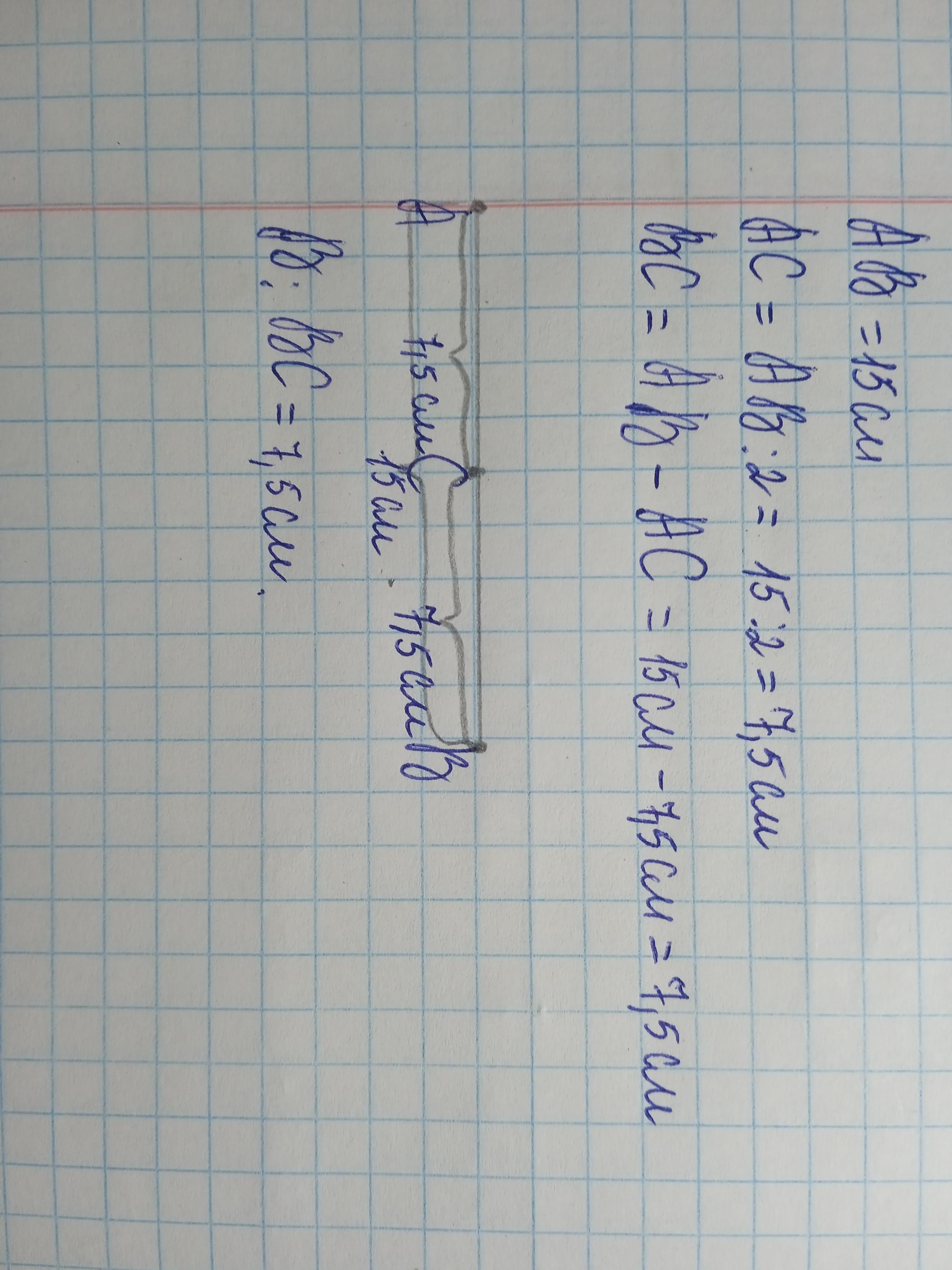 Точки A, B і С лежать на одній прямій. Довжина відрізка AB дорівнює 15 см, а довжина AC у два рази менша за довжину BC. язнайди довжину відрізка BC