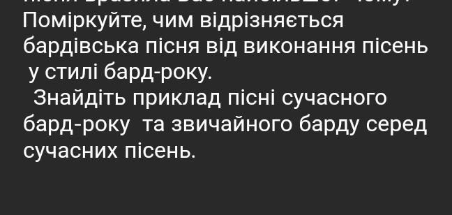 1) Бардівська пісня - це жанр виконавської музики, який з’явився в Україні в 60-х роках XX століття. Вона характеризується тим, що її виконавці самі є авторами текстів та музики своїх пісень. Барди виконують свої пісні зазвичай на гітарі, а також на інших музичних інструментах. Бардівська пісня часто має соціально-політичний зміст, а також може бути присвячена романтиці, природі, історичним подіям тощо.