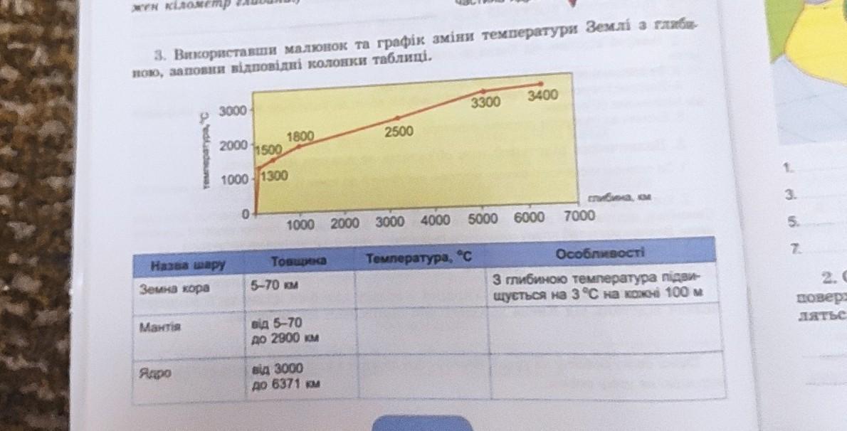 3. Використавши малюнок та графік змiни температури Землі з глиби ною, заповни відповідні колонки таблиці. температура, C Земна кора Мантія Ядро 3000 Назва шару 2000- 1500 1000 1300 0- 1800 1000 2000 3000 4000 Товщина 5-70 км вiд 5-70 до 2900 км 2500 від 3000 ДО 6371 км 3300 Температура, °C 3400 5000 6000 глибина, км 7000 Особливості 3 глибиною температура підви- ЩУється на 3 °C на кожні 100 м