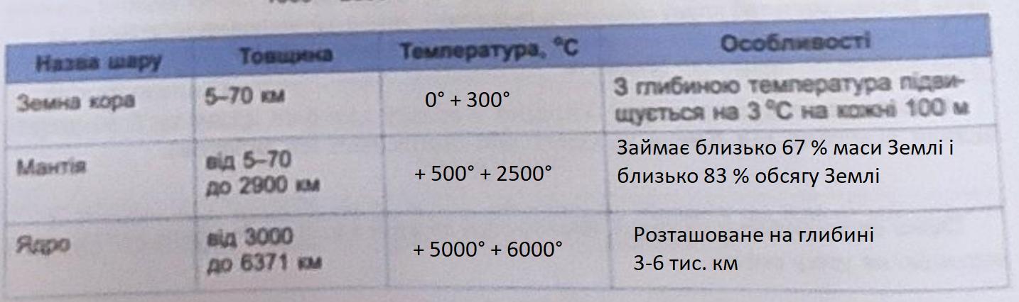 - Використавши малюнок та графік змiни температури Землі з глибиною, ми заповнили відповідні колонки таблиці, яка дана нижче у додатку.