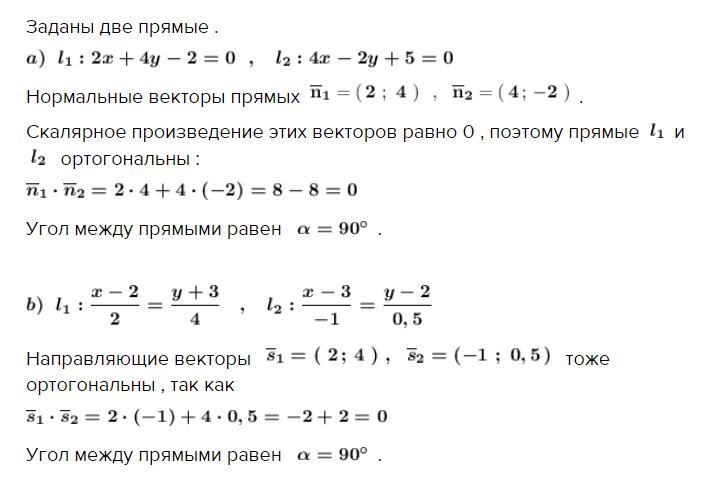 Скалярное произведение этих векторов равно 0 , поэтому прямые и