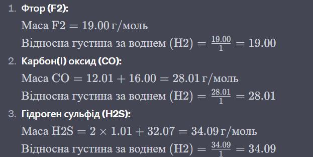 12. Чому дорівнює відносна густина за воднем Н., і за пові трим таких газів, як фтор F., карбон(І) оксид СО, гідро- ген сульфід Н2.Ѕ?