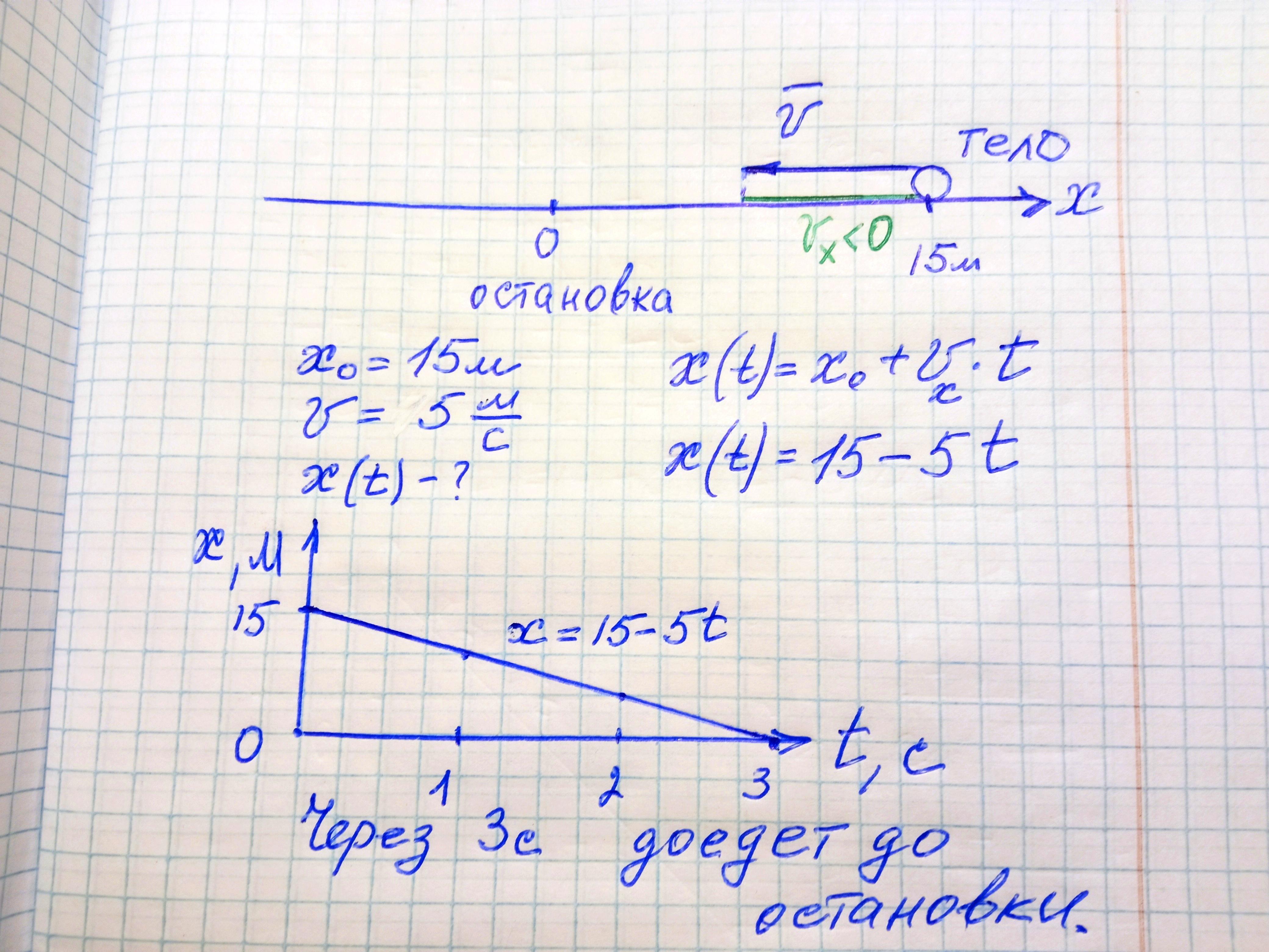 Автобус в начальный момент наблюдения находился на расстоянии 15 м от остановки и двигался к ней со постоянной скоростью 5 м/с. сделайте графический рисунок к задаче. Запишите уравнение движения автобуса.