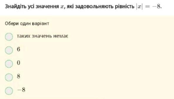 Знайдіть усі значення х, які задовольняють рiвнiсть х=-8. Обери один варіант таких значень немає 6 0 8 -8.