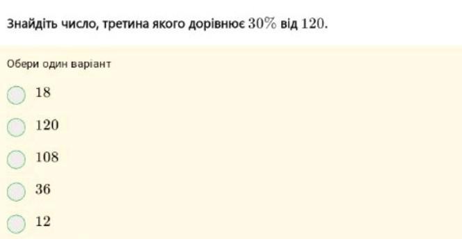 Знайдіть число, третина якого дорівнює 30% вiд 120. Обери один варіант 18 120 108 36 12