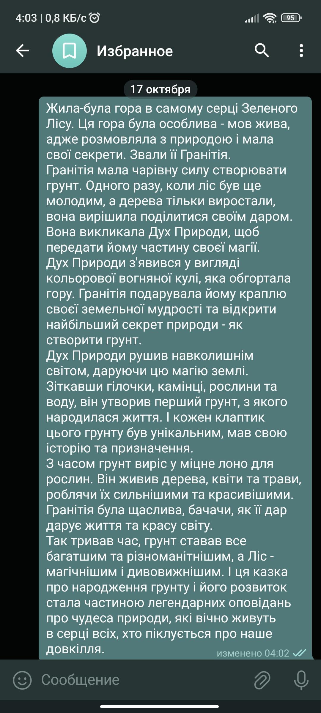 І з того часу, Скеляр, річка та лісова галявина стали найкращими друзями та показали всім, що спільна праця та дружба можуть змінити навколишній світ на краще. Так закінчилася казка про виникнення і розвиток грунту.
