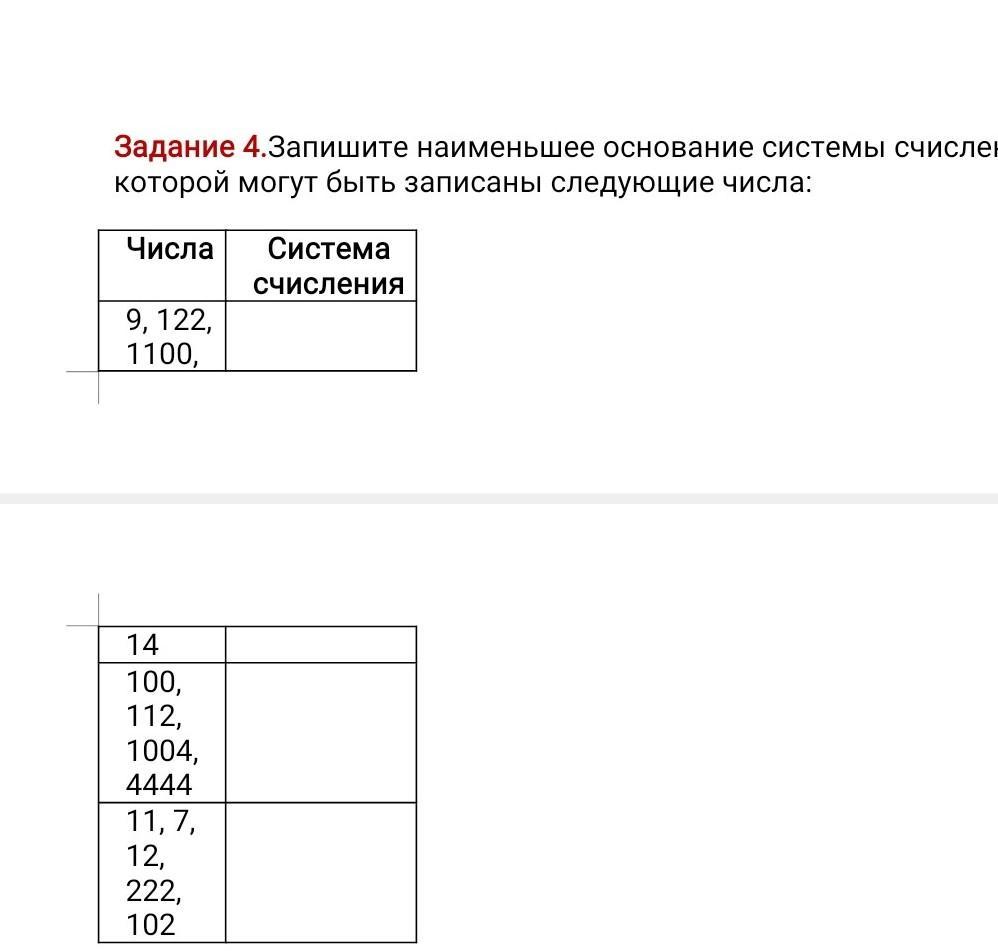 Задание 4.Запишите наименьшее основание системы счисл которой могут быть записаны следующие числа: Числа Система СЧИСЛЕНИЯ 9, 122, 1100, 14 100, 112, 1004, 4444 11,7, 12, 222, 102