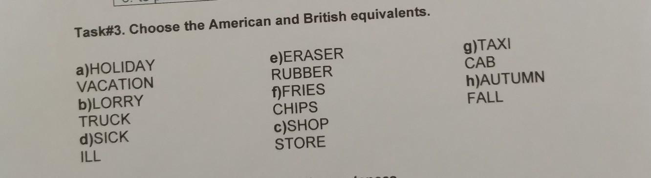 British- holiday, lorry, sick rubber, chips, shop, taxi, autumn (??)
