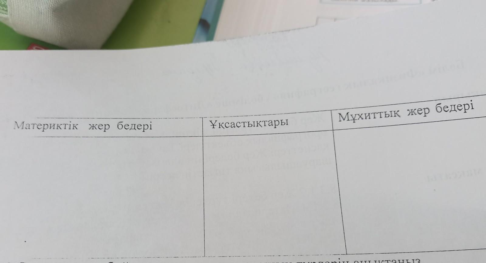 Материктік және мұхиттық жер бедерін салыстырыңыз. мәліметтерді кестеге толтырыңыз