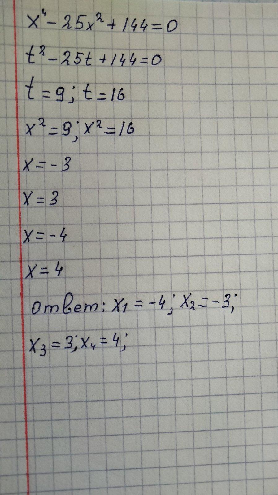 Для розв'язання даного рівняння потрібно знайти значення x, при яких вираз х^4 - 25x^2 + 144 дорівнює нулю.