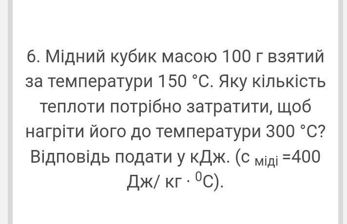 6. Мідний кубик масою 100 г взятий за температури 150 °С. Яку кількість теплоти потрібно затратити, щоб нагріти його до температури 300 °C? Відповідь подати у кДж. (с міді =400 Дж/кг.°С). 2 к Дж 4 к Дж 8 к Дж. помогите можно полное решение паже даю 20 баллов!