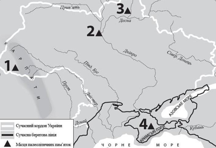 2. Якою цифрою на картосхемі позначено місце розташування Мізинської стоянки - археологічної пам’ятки доби палеоліту?