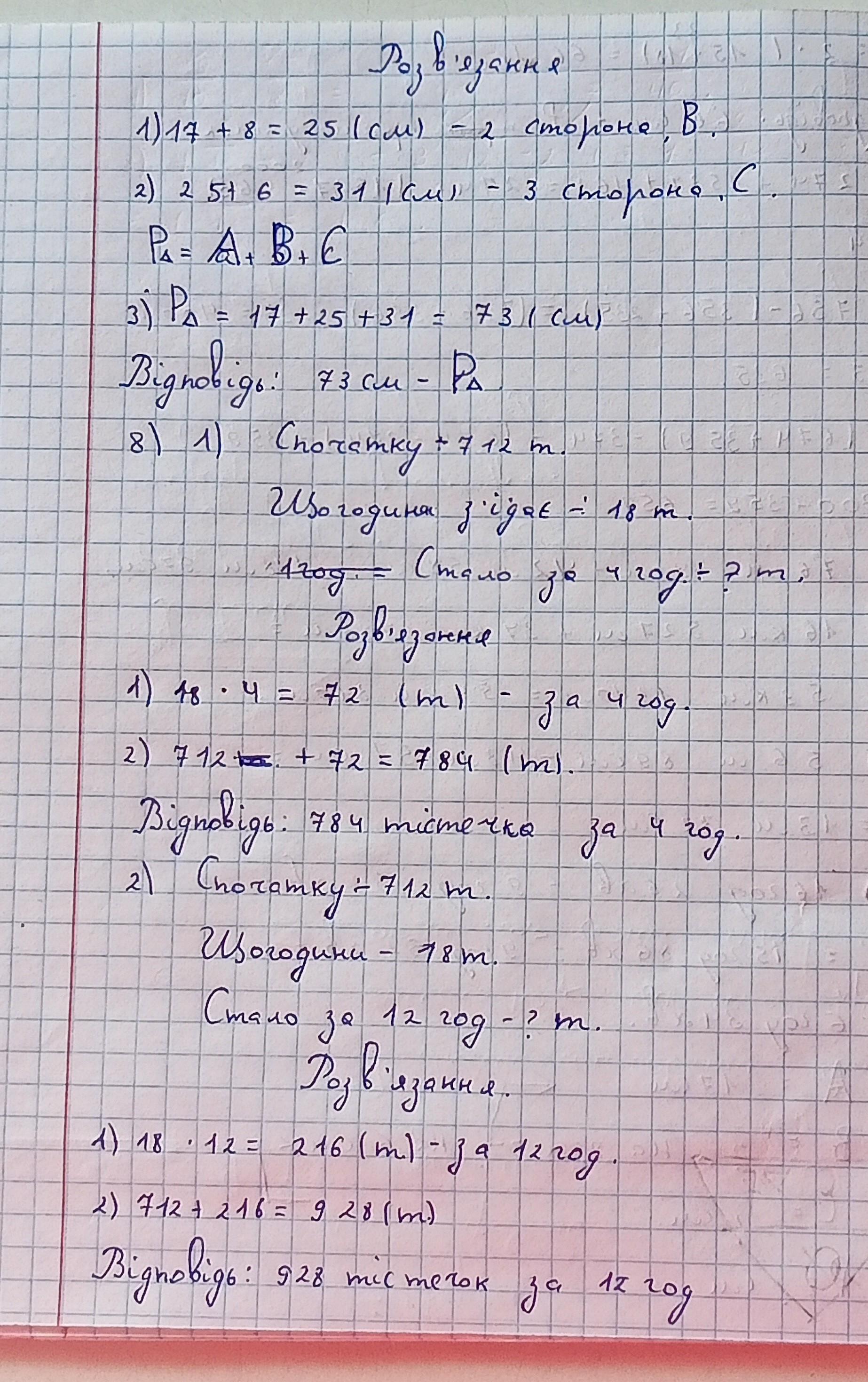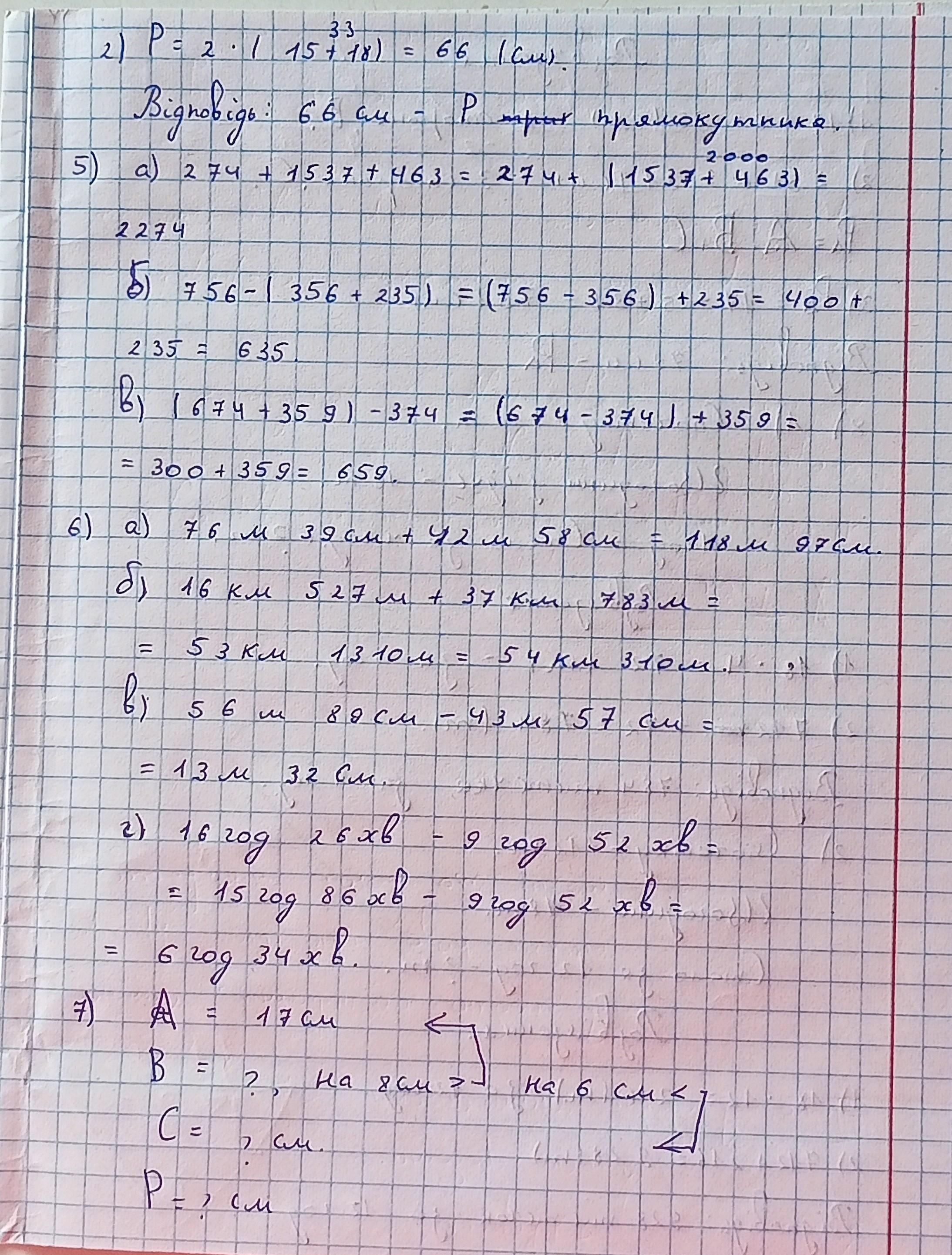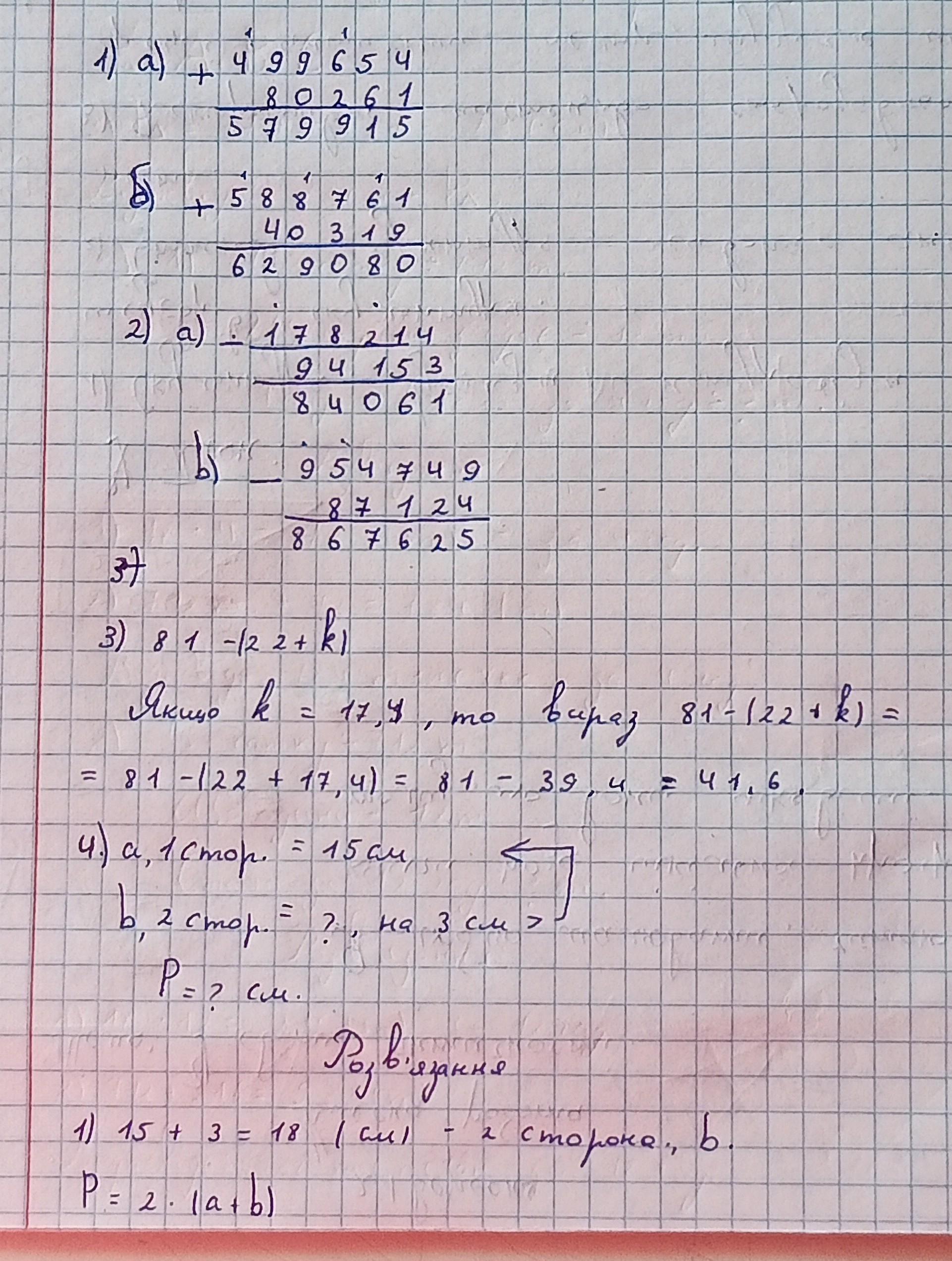 Діагностувальна контрольна робота з теми: « Дії першого ступеня з натуральними числами». 1.(1 бал). Виконайте додавання: a) 499 654 + 80 261 6) 588 761 +40 319 2. (1 бал). Виконайте віднімання: a) 178 214 - 94 153 6) 954 749 87 124 3. (1 бал). Знайдіть значення виразу 81 - (22 + k), якщо k = 17. 4. (1 бал). Знайдіть периметр прямокутника, якщо одна сторона 15 см, а друга на 3 см більше. 5. (2 бали). Обчисліть зручним способом: a) 274 + 1 537 + 463; 6) 756 (356 +235). B) (674 +359) -374. 6. (2 бали). Обчисліть: a) 76 М39см+ 42М58СМ б)16 км527м+37км783м В)56М89СМ-43M57см г)16год26XВ-9год52хв 7. (2 бали). Одна сторона трикутника дорівнює 17 см. Друга сторона на 8см бiльша за першу i на б менше за третю. Знайдіть периметр трикутника. 8. (2 бали). У Пончика було 712 тістечок. щогодини він з'їдав 18 тістечок. Складіть формулу для обчислення кількості тістечок, що залишились у нього через м годин, та обчисліть її, якщо: 1)m=4 2)m=12 срочно дам 64 балла