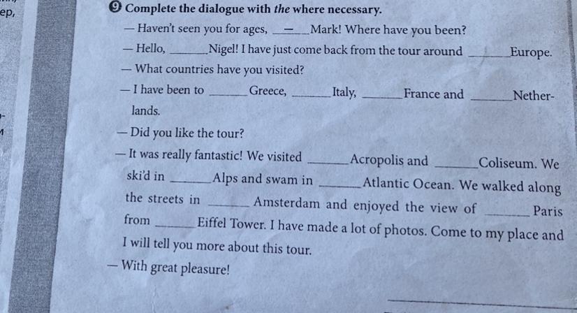 - It was really fantastic. We visited the Acropolis and the Coliseum. We skied in the Alps and swam in the Atlantic Ocean. We walked along the streets in Amsterdam and enjoyed the view of Paris from the Eiffel Tower. I have taken a lot of photos. Come to my place and I will tell you more about this tour.