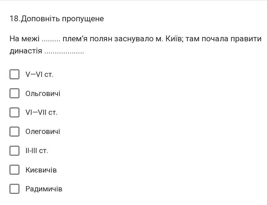 18. Доповніть пропущене На межі ......... плем'я полян заснувало м. Київ; там почала правити династія .......... V-VI CT. Ольговичi VI-VII ст. Олеговичi ||-III ст. Києвичів Радимичів