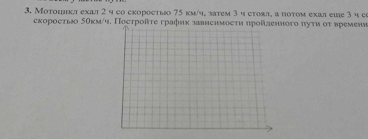 3. Мотоцикл ехал 2 ч со скоростью 75 км/ч, затем 3 ч стоял, а потом ехал еще 3 ч со скоростью 50км/ч. Постройте график зависимости пройденного пути от временидам 70 балов