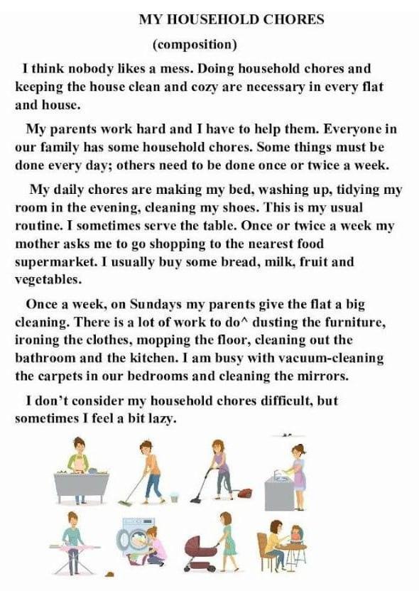 Раз на тиждень, в неділю, мої батьки прибирають квартиру. Роботи багато: видалення пилу з меблів, прасування одягу, миття підлоги, чищення ванної та кухні. Я займаюся пилососом у спальнях та чищенням дзеркал.