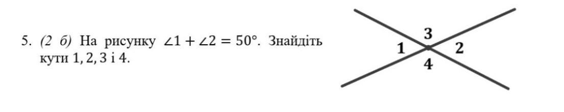 при пересечении двух прямых образуется 4 угла ,две пары вертикальных углов ,которые равны между собой <1=<2,<3 =<4, и смежные углы ,их сумма 180 °, <3+<2 ,например ,1)50:2=25(°)-<1 ,<2 ,2)180 -25=155 (°)-<3,<4..