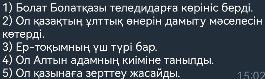 13. Сұрақтарға жауап бер. 1) Болат Болатказы немен айналысады 2) Ол кандай мәселені көтерді? 3) Ер-тоқымның неше түрі бар? 4) Ол неге таңғалды? 5) Қазынаға ненi жаткызады?