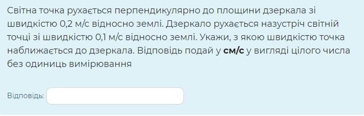Світна точка рухається перпендикулярно до площини дзеркала зі швидкістю 0,2 м/с відносно землі. Дзеркало рухається назустріч світній точці зі швидкістю 0,1 м/с відносно землі. Укажи, з якою швидкістю точка наближається до дзеркала. Відповідь подай у см/с у вигляді цілого числа без одиниць вимірювання